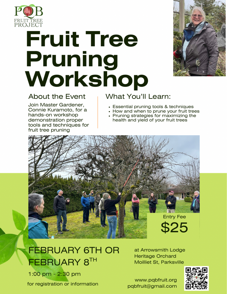 PQB Fruit Tree Project is a Parksville / Qualicum non-profit organization committed to identifying and making use of our local food sources, including fruit trees and gardens, and distributing them to our local community. Through our MAC Community Garden, a 4000 square foot public garden, we help teach and inspire local citizens to grow more food.