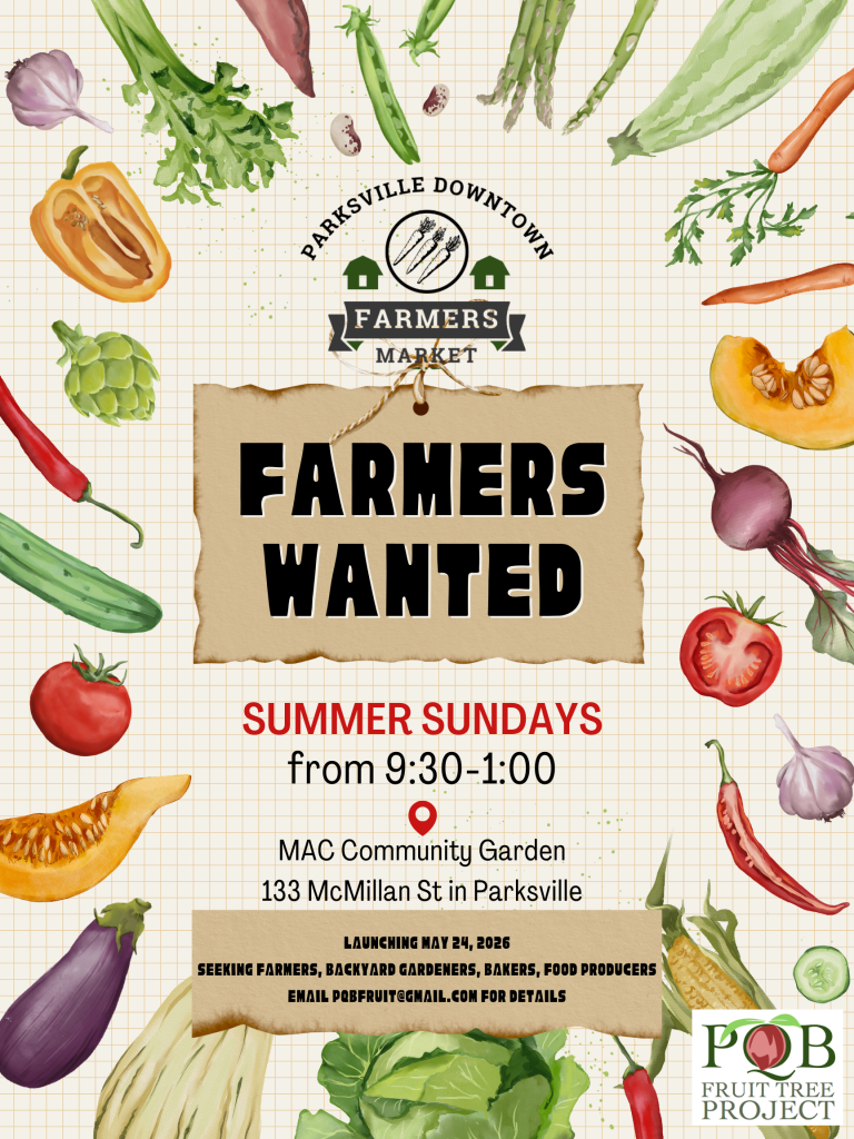 In 2025, we doubled our output from 2024 and gleaned and distributed 4000 free seedlings, 3000 meal units of produce, and 7644 pounds of local fruit. For more information, visit the garden at 133 McMillan St. in Parksville, or email pq******@***il.com. We are generally open from 10:00 ish to 6:00 ish, 7 days a week.